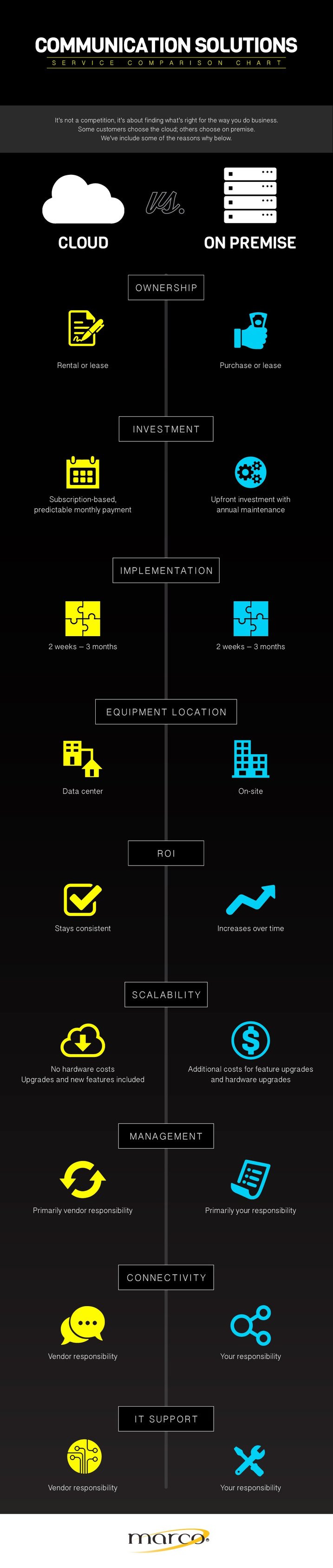 One of the first things you’ll need to decide is whether your communication solution will be located at your facility or hosted in the cloud. To make that part easy, we created the following infographic…