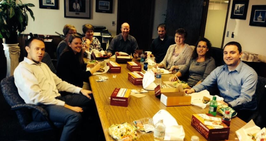 Marco teammates enjoy their first lunch as a team in the newly acquired Northeast Photocopy office.